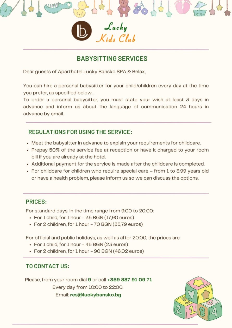 Lucky Bansko is a hotel with a children’s play area, suitable for children from 4 to 6 years old. It is equipped with a variety of toys designed for this age according to the Montessori method.