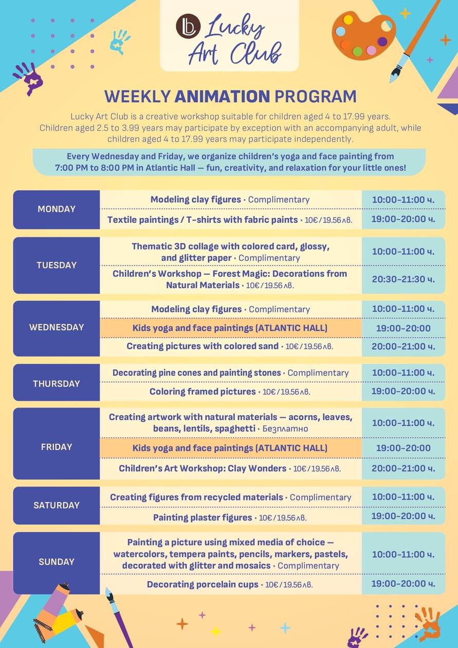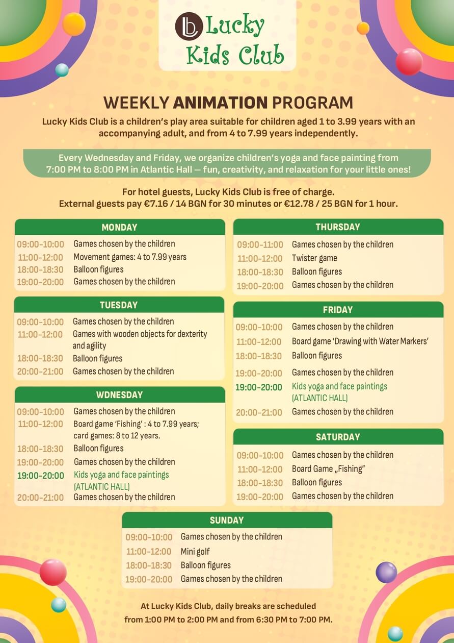 Every guest of the hotel can drop off their child at the selected times, for which the parent must fill out an information form. The animators at Aparthotel Lucky Bansko are responsible for your child until they hand it back to you.