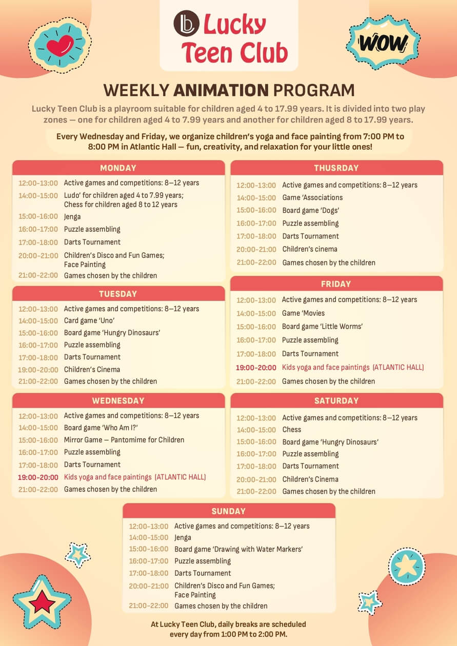 The kid’s corner and the Teen club are furnished in accordance with the age of the children, and their care is entrusted to experienced animators.